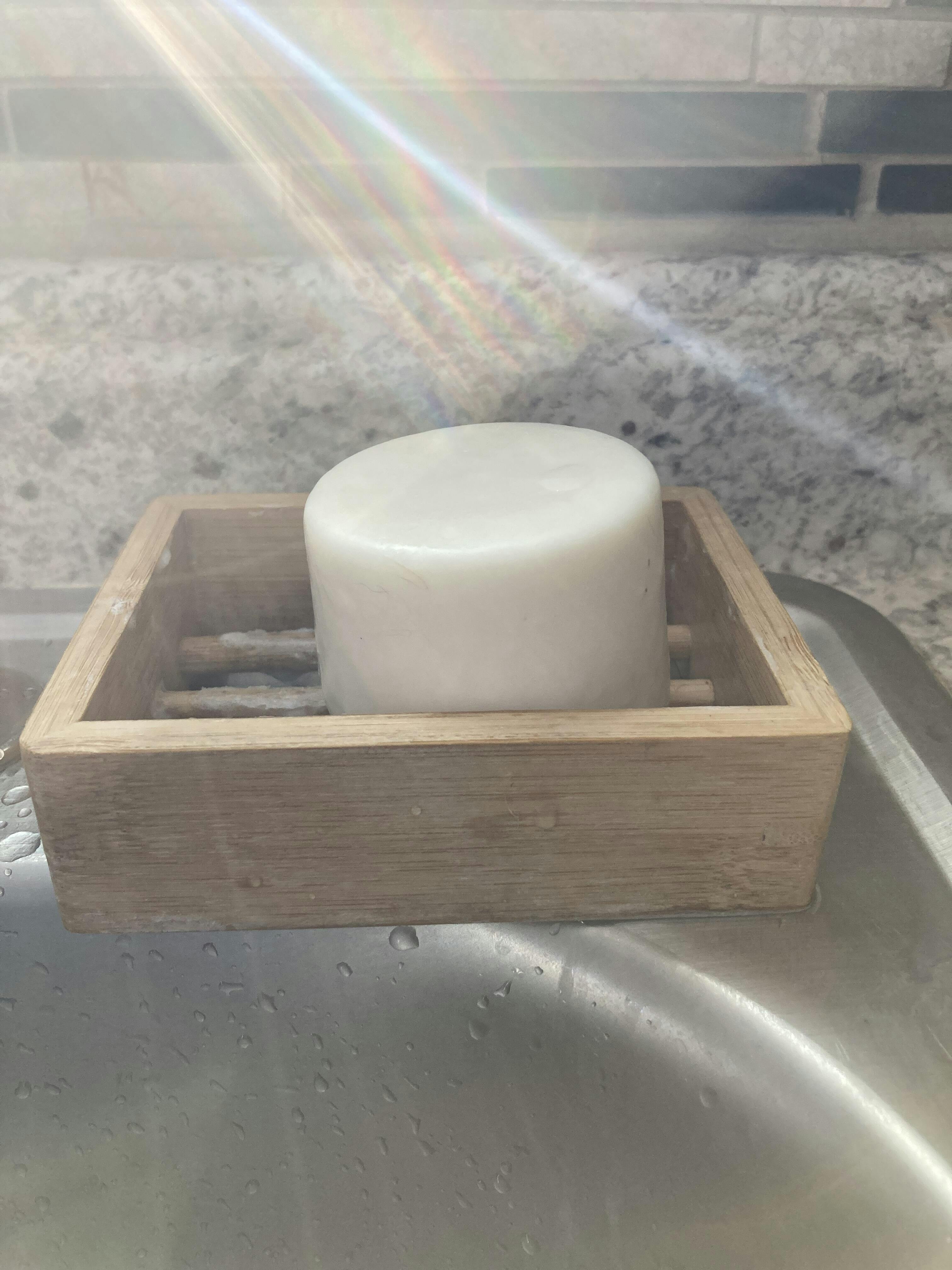 How to use: Simply wet your plastic-free sponge or brush and rub the soap bar to create effective suds. To soak dishes, hold the soap puck under running water and allow the sink to fill with suds! Keep bar dry and elevated from water when not in use.