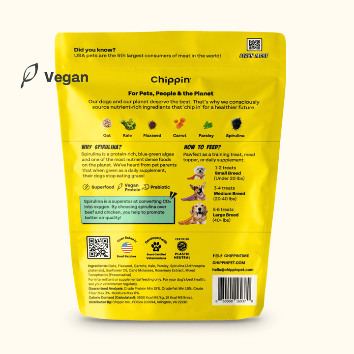 Promote your dog's well-being and the environment with Chippin® Veggie Dailies – the sustainable, nutrient-rich dog snacks containing real vegetables and cricket protein. Chippin® is committed to tackling climate change by offering these treats. The Veggie Dailies are carefully made with eco-friendly ingredients such as cricket protein, which greatly reduces the use of land, water, and greenhouse gases compared to regular animal-based proteins. And not just that, they are produced in the USA using upcycled and non-GMO ingredients, reducing food waste and minimizing the environmental footprint from farm to bowl.